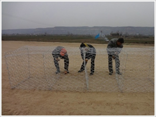4.前板、后板和尾板大致向垂直方向開口,呈開口箱形。 側(cè)翼應(yīng)適當(dāng)折疊并相互重疊。 所有隔板和尾板應(yīng)固定并固定在前后板上。 組裝時(shí),鍍鋅石籠網(wǎng)應(yīng)與周圍表面、尾部和空間一起安裝,并應(yīng)確保所有折痕處于正確的方向,每個(gè)側(cè)面的頂部水平。 后,鍍鋅石籠網(wǎng)的邊緣通過絞合鋼絲連接。